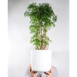 In een notendop Polyscias zijn kleine boompjes voor bij jou in huis! Oorspronkelijk groeit de Polyscias op eilanden in de Pacifische oceaan. In het wild worden deze bomen zoβn 2 – 6 meter hoog en zorgen ze met hun grote bladeren voor veel schaduw. Polyscias betekent dan ook βveel schaduwβ in het Grieks. Deze twee soorten hebben echter een handiger formaat, zodat je binnenshuis ook van ze kunt genieten. Polyscias scutellaria βFabianβDe βFabianΒ΄ is een compacte kamerplant met een dikke houten stam. Dit kleine, vertakkende boompje krijgt bladeren over de volledige lengte van zijn takken. Dit zorgt voor een fijne mix aan natuurlijke kleuren. De donkergroene bladeren hebben een leerachtig karakter en krullen enigszins naar buiten. Aangezien dit dwergboompje mooi recht en compact blijft, heb je zo een plekje gevonden in huis. Deze stoere blikvanger zorgt gegarandeerd voor sfeer in ieder interieur. Polyscias fruticosaDe Polyscias fruticosa staat ook bekend als de Ming Aralia. Hij bestaat uit vele opwaarts-groeiende vertakkingen, waardoor het geheel eruit komt te zien als een groepje van meerdere bomen. Het heeft kleine, groene bladeren die zacht aanvoelen en helder van kleur zijn. Het gebladerte heeft wat weg van varenblad. Met dit artistieke binnenboompje krijgt je interieur een heerlijk tropisch gevoel. Alles op een rijtje – Geleverd als een set van 2 verschillende Polyscias boompjes- De leveringshoogte van deze planten zijn 60 cm (incl. pot)- Geleverd in kweekpotten van 17 cm- Compacte boompjes voor in huis- Blijft mooi recht omhoog groeien- Latijnse namen: – Polyscias scutellaria- Polyscias fruticosa Verzorging Een Polyscias houdt niet van droge lucht, daar vallen zijn bladeren van uit. Dit maakt het een perfecte plant voor in de badkamer of keuken. Op andere plekken in huis kan hij ook prima staan, zolang je zorgt voor voldoende luchtvochtigheid. Dit kun je doen door hem op een bodem van kiezelstenen te plaatsen, of af en toe nat te spuiten met een plantenspuit. Hij kan vrijwel overal staan, behalve in direct zonlicht. Geef hem water zodra de potgrond is opgedroogd. Je kunt beter iets te lang wachten dan dat je hem te snel weer water geeft. Bloomique Bloemen en planten brengen de plaatsen waar we leven, pas echt tot leven. Het zijn aankopen of cadeauβs waar je geen genoeg van krijgt. Ons assortiment van kamer- en tuinplanten heeft voor ieder interieur en tuin een stijlvolle match. Een sfeervol thuis, dat is pas een fijn geschenk! Door altijd fair-trade te handelen garanderen we dat jij niet de enige bent die gelukkig wordt van onze bloemen en planten. Bloomique streeft naar optimale bescherming tijdens de verzending. Onze speciale plantenverpakking zorgt er voor dat de plant op de juiste positie blijft. Onze verpakkingstechniek houdt rekening met het beschermen van de wortels, bladeren en bloemen van de plant. Zo blijven ze gezond en onbeschadigd als ze onderweg zijn met de pakketdienst naar jou!Iedere plant is uniek. De afbeeldingen die je hier ziet zijn van de verwachte resultaten wanneer de planten volgroeid zijn. Verschillende groeiomstandigheden kunnen voor een andere uitkomst zorgen. Ga daarom voor aankoop goed na of deze planten geschikt zijn voor jouw huis of tuin.
