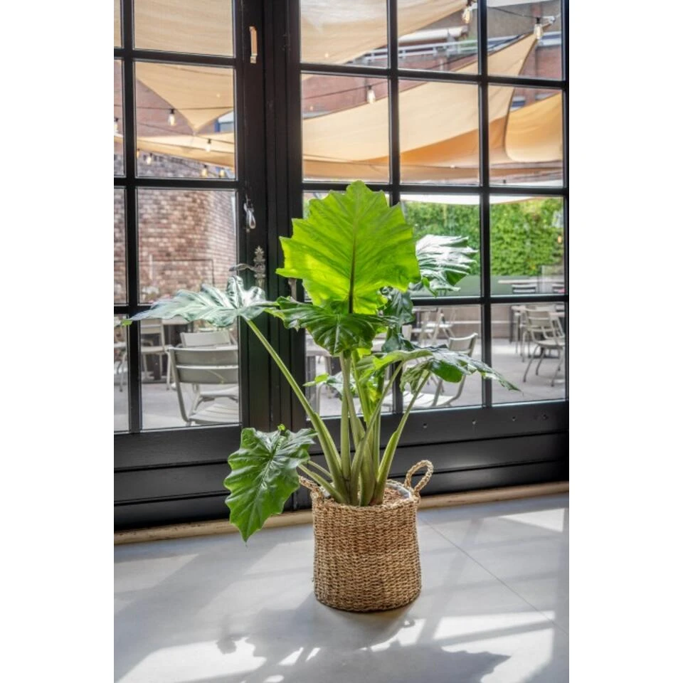 In een notendop Alocasia planten ken je misschien wel beter onder de naam olifantsoor. Niet verrassend hebben ze die naam te danken aan de bladeren die gevormd zijn als de oren van olifanten. In hun originele standplaats van deze plant is het oerwoud. Spuit daarom regelmatig de bladeren nat te sproeien met een plantenspuit. Hiermee voorkom je bruine bladranden. De volgroeide hoogte is ongeveer 200 cm worden, dus geef deze mooie plant voldoende plek. Draai de plant regelmatig, anders krijgt hij een kale achterkant. Deze plant heeft een luchtzuiverende werking. Alles op een rijtje – Deze Alocasia ‘Portadora’ wordt per stuk geleverd- De leveringshoogte van deze plant is 80 cm (incl. pot)- Geleverd in een kweekpot van 21 cm- Felgroene, hartvormige bladerenVerzorging Alocasia planten houden van een warme, luchtvochtige omgeving. Je kunt ze beter niet in direct zonlicht plaatsen. Kies daarom voor lichte standplaats, zonder direct zonlicht. Je geeft ze lauwwarm water. Dit kun je het best vaak in kleine hoeveelheden doen. Op deze manier behoudt de potgrond de ideale mate van vochtigheid. Om de luchtvochtigheid te bevorderen kun je ze een bodem van kiezelstenen in de pot geven en af en toe besproeien met een plantenspuit. Alocasias hebben een tijdelijke rustperiode waarin de bladeren tijdelijk vervagen. In deze periode hebben ze minder water nodig. Bloomique Bloemen en planten brengen de plaatsen waar we leven, pas echt tot leven. Het zijn aankopen of cadeauβs waar je geen genoeg van krijgt. Ons assortiment van kamer- en tuinplanten heeft voor ieder interieur en tuin een stijlvolle match. Een sfeervol thuis, dat is pas een fijn geschenk! Door altijd fair-trade te handelen garanderen we dat jij niet de enige bent die gelukkig wordt van onze bloemen en planten. Bloomique streeft naar optimale bescherming tijdens de verzending. Onze speciale plantenverpakking zorgt er voor dat de plant op de juiste positie blijft. Onze verpakkingstechniek houdt rekening met het beschermen van de wortels, bladeren en bloemen van de plant. Zo blijven ze gezond en onbeschadigd als ze onderweg zijn met de pakketdienst naar jou!Iedere plant is uniek. De afbeeldingen die je hier ziet zijn van de verwachte resultaten wanneer de planten volgroeid zijn. Verschillende groeiomstandigheden kunnen voor een andere uitkomst zorgen. Ga daarom voor aankoop goed na of deze planten geschikt zijn voor jouw huis of tuin.