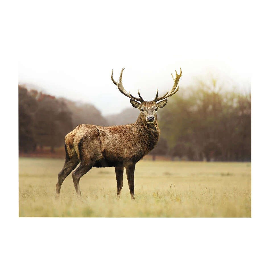 Dit canvas heeft een prachtige afbeelding van een majestueus hert in het bos, prachtig weergegeven in bruine en groene tinten. De stijl is zowel romantisch als dierlijk, met verfijnde details die de natuur vastleggen.