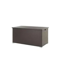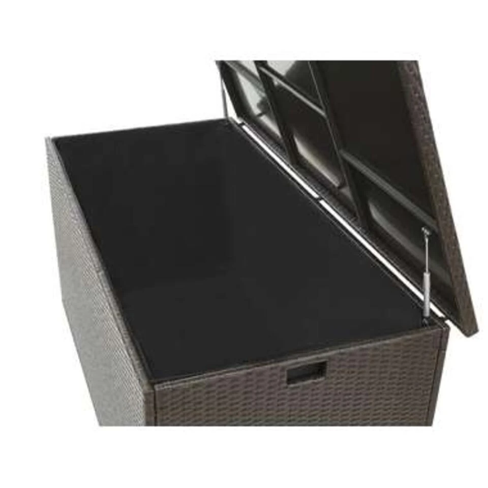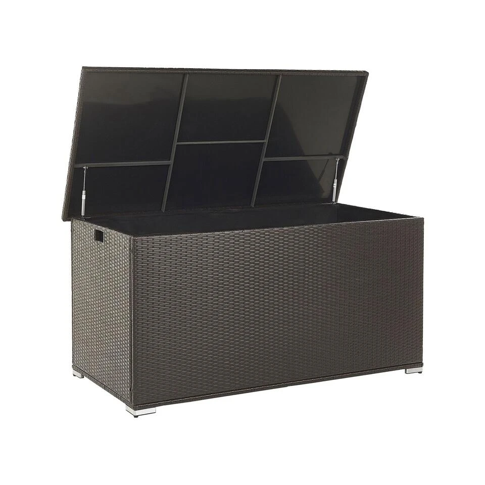 Praktische, brede opbergbox in bruin met veel opbergruimte. Deze kussenbox biedt veel opbergruimte en beschermt jouw kussens en dekens tegen water en zon. Dankzij de twee praktische handgrepen aan de zijkanten is de tuinkist gemakkelijk te vervoeren. Het rotandeksel kan gemakkelijk worden geopend en gesloten met twee gasveren. Een zwarte binnenschaal voorkomt het binnendringen van vuil en insecten. Het binnenste omhulsel uit één stuk is bevestigd met een sterke klittenbandsluiting en heeft dus optimale grip en kan indien nodig worden vervangen of gewassen. Houd er rekening mee dat bij zware en langdurige regenval de doos moet worden afgedekt.