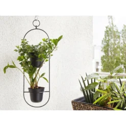 Hangende plantenpot met 2 niveaus. Deze hangende plantenbak is een geweldige manier om een bloemig accent aan je huis of balkon te geven. Het minimalistische ontwerp met gebogen silhouet past goed bij elke interieurstijl, waardoor het stuk een geweldige wanddecoratie is. De bloempotten zijn gemaakt van stevig metaal, de zwarte tweelaags constructie is zeer gemakkelijk te onderhouden en zal je jarenlang van dienst zijn.