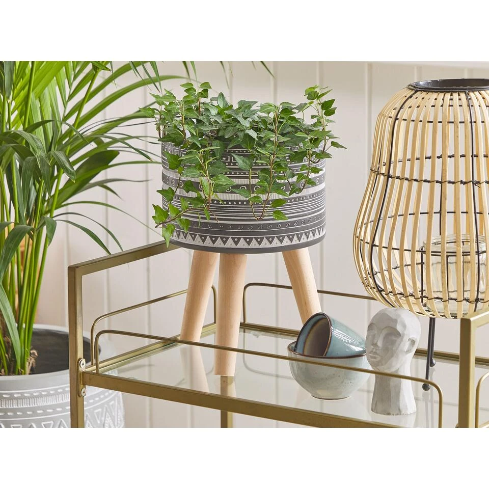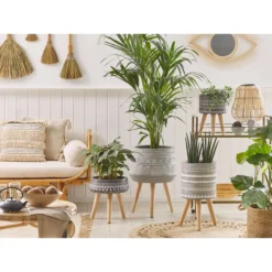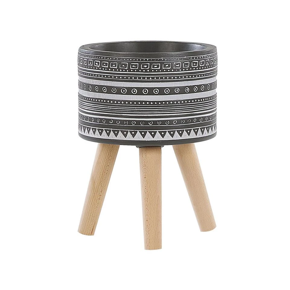 Moderne ronde plantenbak in grijze kleur voor binnen en buiten. Een moderne bloembak dat perfect zal werken in elk industrieel en minimalistisch interieur. Dankzij de combinatie van een diepe, grijze pot en een hoge houten standaard, kun je eenvoudig je favoriete bloemen laten zien. De set wordt geleverd met een plastic inzetstuk dat de pot beschermt tegen vocht en aarde en het verplanten van planten vergemakkelijkt.