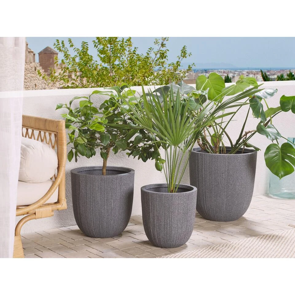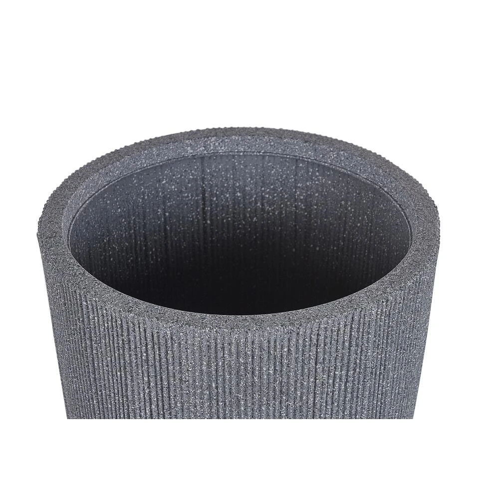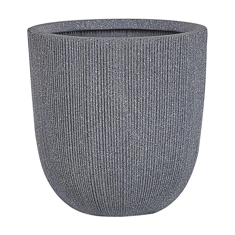 Grijze bloempot met gegroefde structuur. Bloempotten met planten geven vaak de finishing touch aan een interieur of de terrasopstelling. Deze ronde plantenpot met krijtstreep in een altijd mooie grijze kleur is een ideale oplossing voor zowel grote planten als voor tal van kleinere bloemen. Een natuurlijke compositie met deze bloempotten barst van de natuurlijke sfeer en geeft een decoratief karakter aan elk terras, balkon of zelfs een woonkamer. De weersbestendigheid van de polyresin zorgt ervoor dat de plantenbak er altijd verzorgd uitziet.