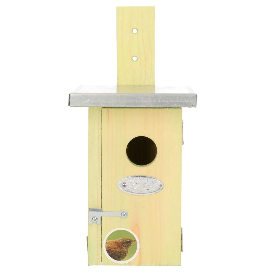 Houten nestkast winterkoning. Deze nestkast biedt de winterkoning een fijne plek om te nestelen. In de winter maken vogels vaak gebruik van deze nestkastjes om zich schuil te houden tegen het slechte weer. Een nestkastje zou in geen enkele tuin mogen ontbreken.De nestkast winterkoning is gemaakt van natuurlijke materialen.