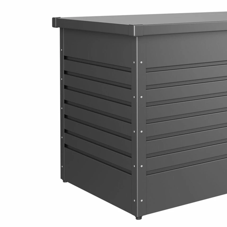 De opbergbox is gemaakt van hoogwaardig metaal met een stevige poedercoating in de kleur donkergrijs metallic. De opbergbox is voorzien van een stevige deksel met een gasveer, waardoor de deksel gemakkelijk open en dicht kan. Als de kussenkist buiten staat, dan is het aan te raden om de kussens eerst in een lounge kussentas te doen alvorens deze in de box op te bergen. De kussenkist is nagenoeg wind en waterdicht, maar door de kieren rondom de deksel is het mogelijk dat er vocht naar binnen kan komen.