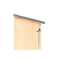 Houten mussenvilla/mussenhuisje ongeveer 47 cm met zinken dak. Aan de achterkant van het vogelhuisje zit een kijkluik zodat je kunt zien wat er zich afspeelt in het nestkastje.