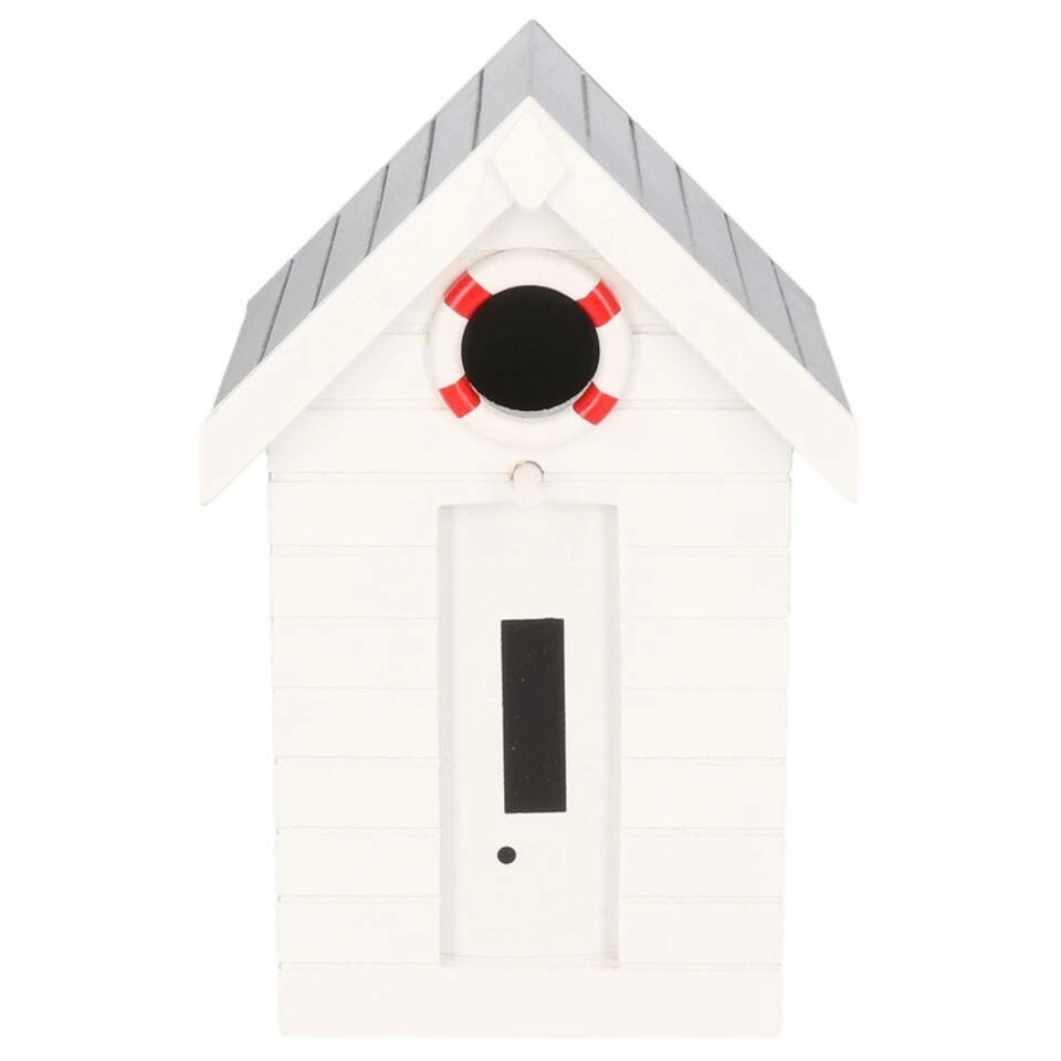 Wit houten vogelhuisje/nestkastje met grijs dak gedecoreerd als strandhuisje. Het formaat is ongeveer 14 x 13 x 21 cm. Materiaal: MDF. Aan de bovenzijde zit een koord om het vogelhuis mee op te hangen. Bevestigingsmateriaal niet inbegrepen. Een leuk huisje voor kleine vogeltjes zoals: pimpel/koolmeesjes, musjes en andere kleine vogels rondom het huis. Door langdurige blootstelling aan de weersomstandigheden zal het product verkleuren en de verf/opdruk vervagen. Tuindecoratie accessoires vogelhuisje/nestkastje.
