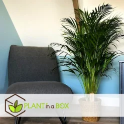 De beroemde en zeer populaire Areca palm, ook bekend als de Goudpalm, komt oorspronkelijk uit de vochtige tropen van Madagaskar. Areca palmen kunnen buiten in de regenwouden tot wel 12 meter hoog worden. Binnen blijft de plant echter veel kleiner en wordt meestal niet groter dan 2 meter. De Areca is nummer één op de lijst van beste luchtzuiverende planten, en zuivert de omgeving waarin hij wordt geplaatst door het verwijderen van gevaarlijke chemicaliën zoals formaldehyde, xyleen en tolueen. Dit maakt de Areca ook zeer populair in kantoren. Afgezien van zijn nuttige eigenschappen, ziet de Areca er ook gewoon mooi uit met zijn smalle, glanzende bladeren.
