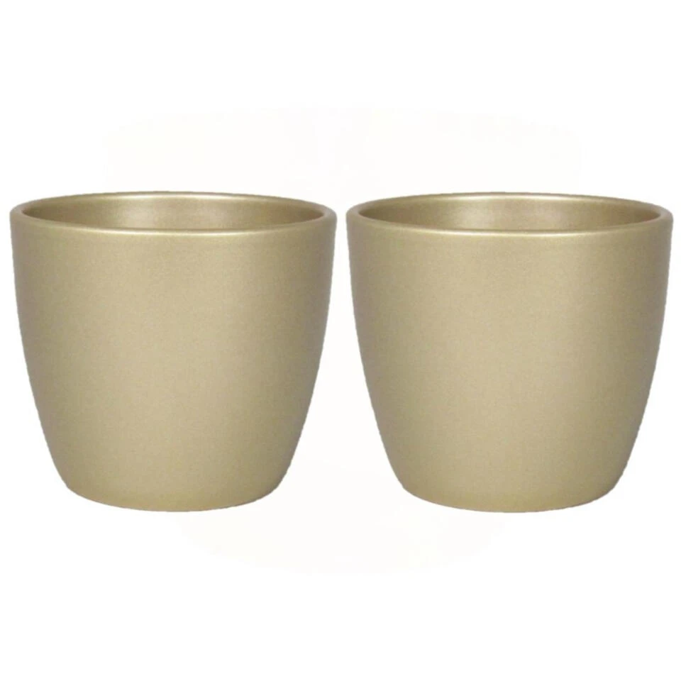 Kleine bloempot/plantenpot van keramiek in het parelgoud. Bloempotten met een mooie gladde afwerking aan de buitenkant. Gewicht: 1.1 kilo. Het keramiek heeft een coating zodat het geen water opzuigt. Formaat: diameter 17.5 cm, hoogte 15 cm. Model: Boule.