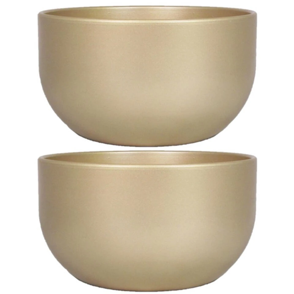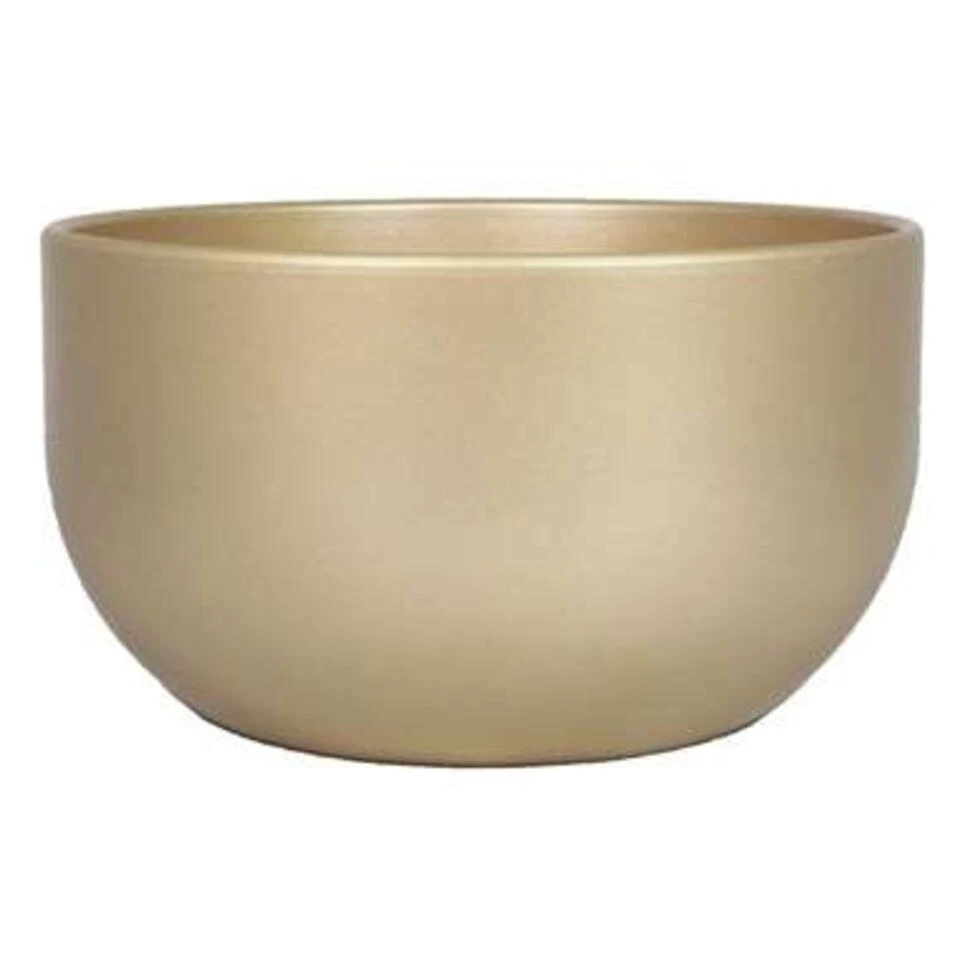 Bloempot/plantenpot schaal van keramiek in het parelgoud. Bloempotten met een mooie gladde afwerking aan de buitenkant. Gewicht: 1.94 kilo. Het keramiek heeft een coating zodat het geen water opzuigt. Formaat: diameter 26 cm, hoogte 14 cm. Model: Boule.