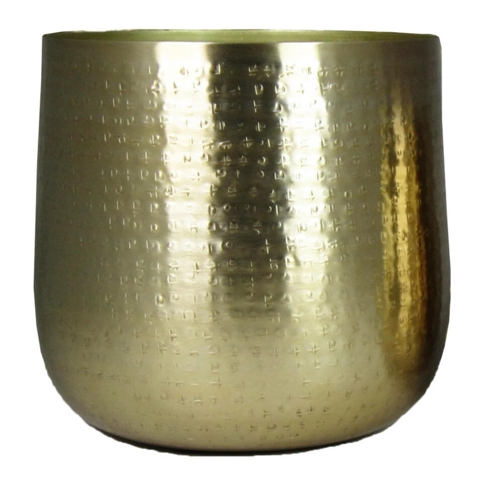 Bloempot/plantenpot Larisa XL van metaal goud. Bloempotten met een mooie afwerking aan de buitenkant. Gewicht: 1.7 kilo. Metaal is onmisbaar in een groen en comfortabel interieur. Decoreer de pot met droogbloemen of een diep groene plant voor een luxueus jungle effect.