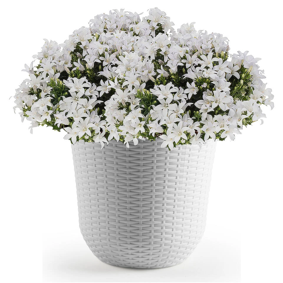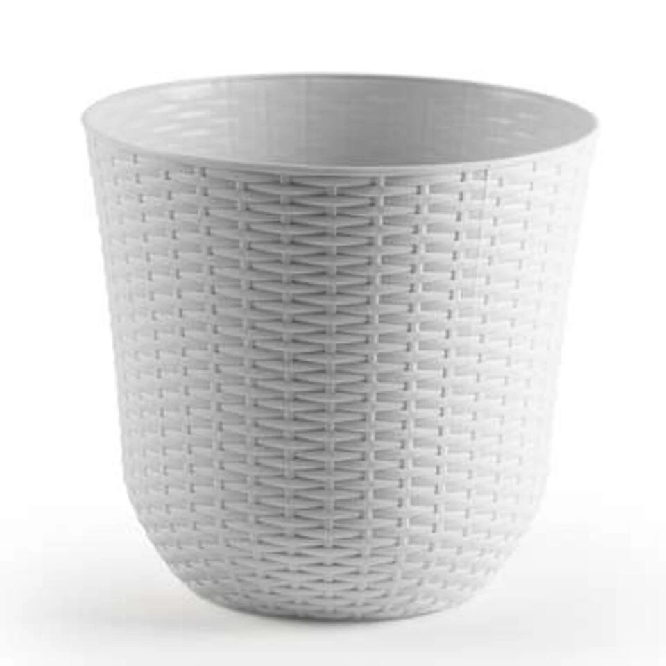 1x Witte plantenbakken/bloempotten 32 cm. Gevlochten, kunststof plantenbak/bloembak in de kleur donkerwit. Het formaat van deze ronden bloemen/planten bak is ca. 32,5 x 32,5 x 30,5 cm. Materiaal: kunststof.