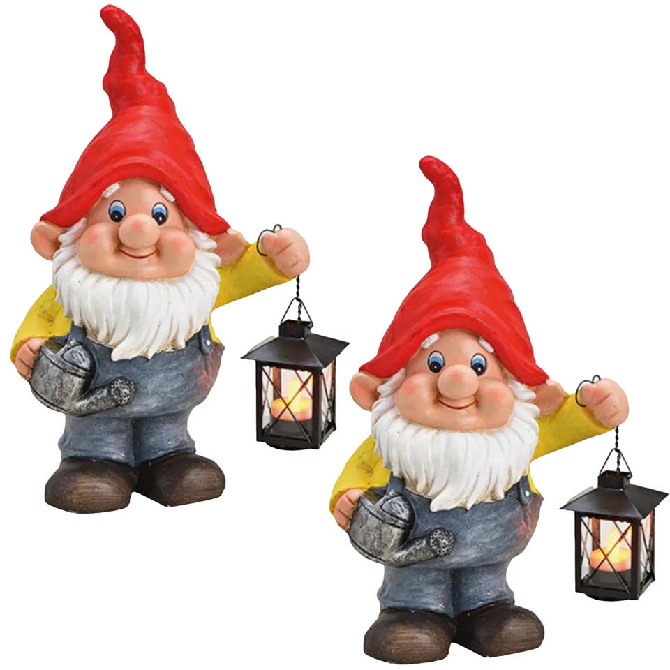 Tuinkabouter met met lantaarn voor een theelichtje. Dit tuinkabouter beeld heeft een formaat van ca. 24 x 15 x 40 cm en is gemaakt van polystone met metaal en glas. Geschikt voor een echt kaarsje! Tuindecoratie/tuinversiering kabouters.