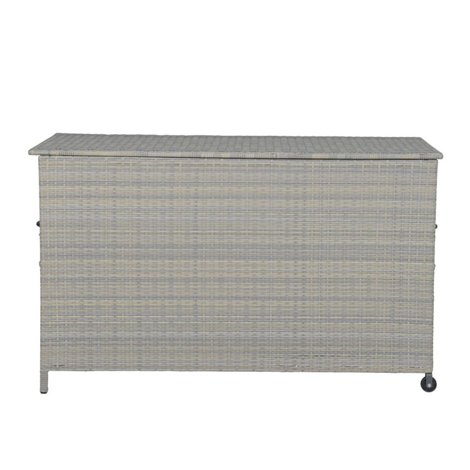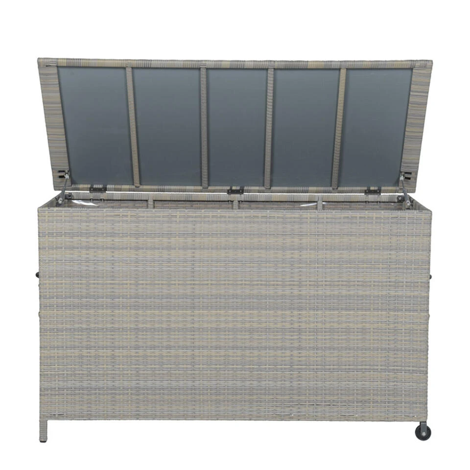 Ruime en praktische kussenkist waarin je gemakkelijk de kussens van je loungeset in op kunt bergen. Heb je bijvoorbeeld geen ruimte in de schuur, dan is een mooie hand gevlochten wicker kussenkist een goede keus. Met de York kussenkist heb je geen werk meer aan het opbergen van je kussens, je legt de kussens eenvoudig in de kussenkist. Zo liggen ze nooit meer in de weg. De kist is gemaakt van een stevig aluminium frame met daar omheen weerbestendig hand gevlochten vintage willow kleurig wicker vlechtwerkdraad. Wicker is een stevig en duurzaam kunststof. De kussenkist is voorzien van een mooie deksel met een gasveer, waardoor de deksel gemakkelijk open en dicht kan. Daarnaast beschikt de kist over stevige kunststof platen aan de binnenzijde om vocht tot het minimum te beperken. Je verplaatst de kussenkist gemakkelijk door de twee wielen aan de ene kant en het mooie grote handvat aan de tegenovergestelde kant. Als de kussenkist volledig in de buitenlucht staat, dan is het aan te raden om de kussens eerst in een lounge kussentas te doen alvorens deze in de kist op te bergen. De kussenkist is nagenoeg wind en waterdicht, maar door de kieren rondom de deksel is het mogelijk dat er vocht naar binnen kan komen. De buitenmaat van deze kussenkist is: B 166 x D 76 x H 99 cm. De binnenmaat is: B 160 x D 73 x H 88 cm.