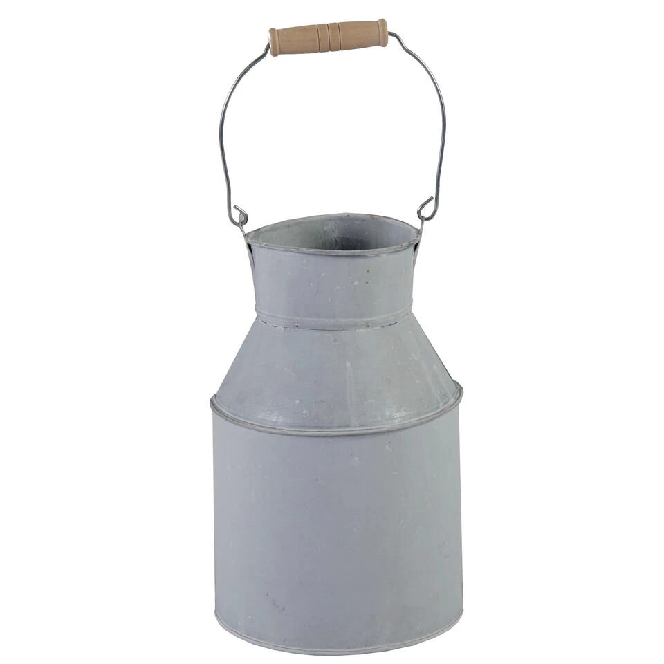 Melkbus plantenpot/bloempot gemaakt van zink in de kleur lichtgrijs met houten handvat. Melkbus uit de Bob serie kan zowel binnen als buiten gebruikt worden ter decoratie, maar ook geschikt als plantenpot/bloempot. Afmetingen: Diameter 13 cm en Hoogte 20 cm. Let op: zink is niet 100% waterdicht.