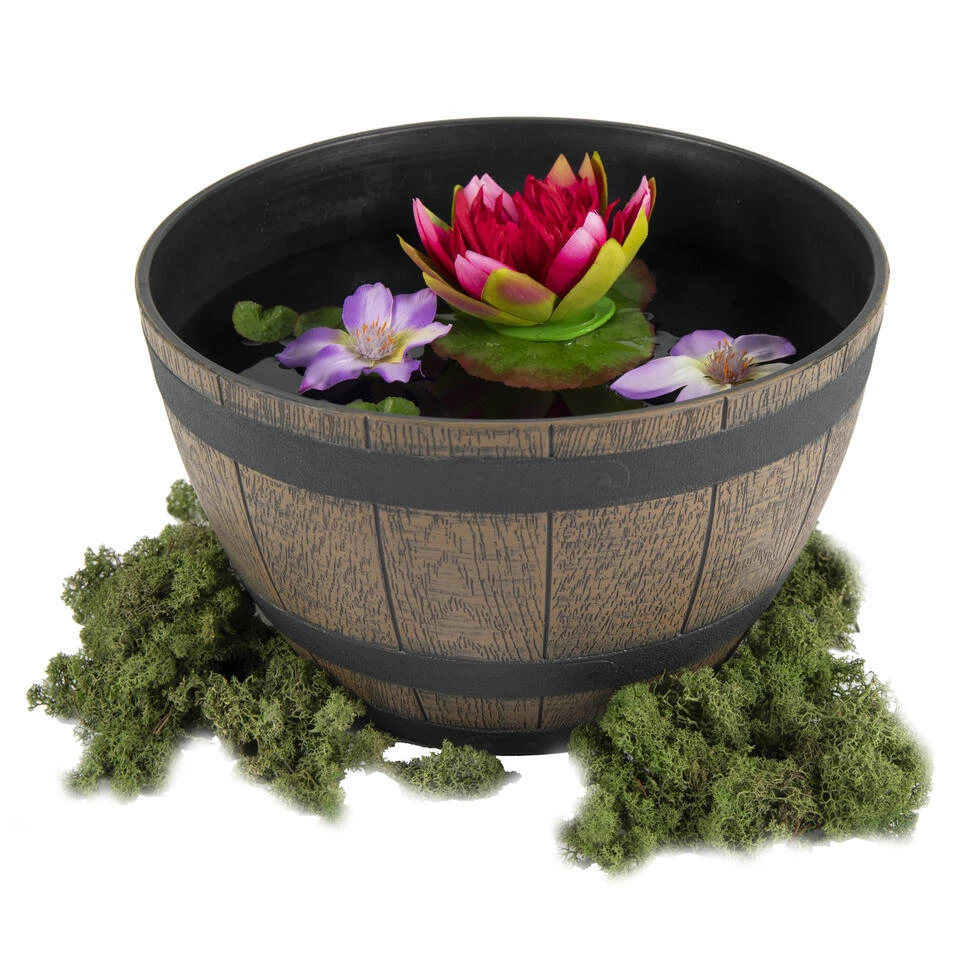Bloempot/plantenpot uit de Barrel Bowl serie gemaakt van kunststof. Het vat heeft een natuurlijke uitstraling doordat het ontwerp is geinspireerd op een houten vat. De kleur van de plantenbak is bruin met twee zwarte randen aan de buitenkant. Het houtmotief van de pot zorgt voor een warme en natuurlijke sfeer in de omgeving waar het wordt geplaatst. Niet alleen te gebruiken voor bloemen/planten, maar ook als decoratie of als minivijvertje voor op uw terras. Afmetingen: Diameter 40 cm x Hoogte 25 cm. Het vat heeft een ronde vorm.