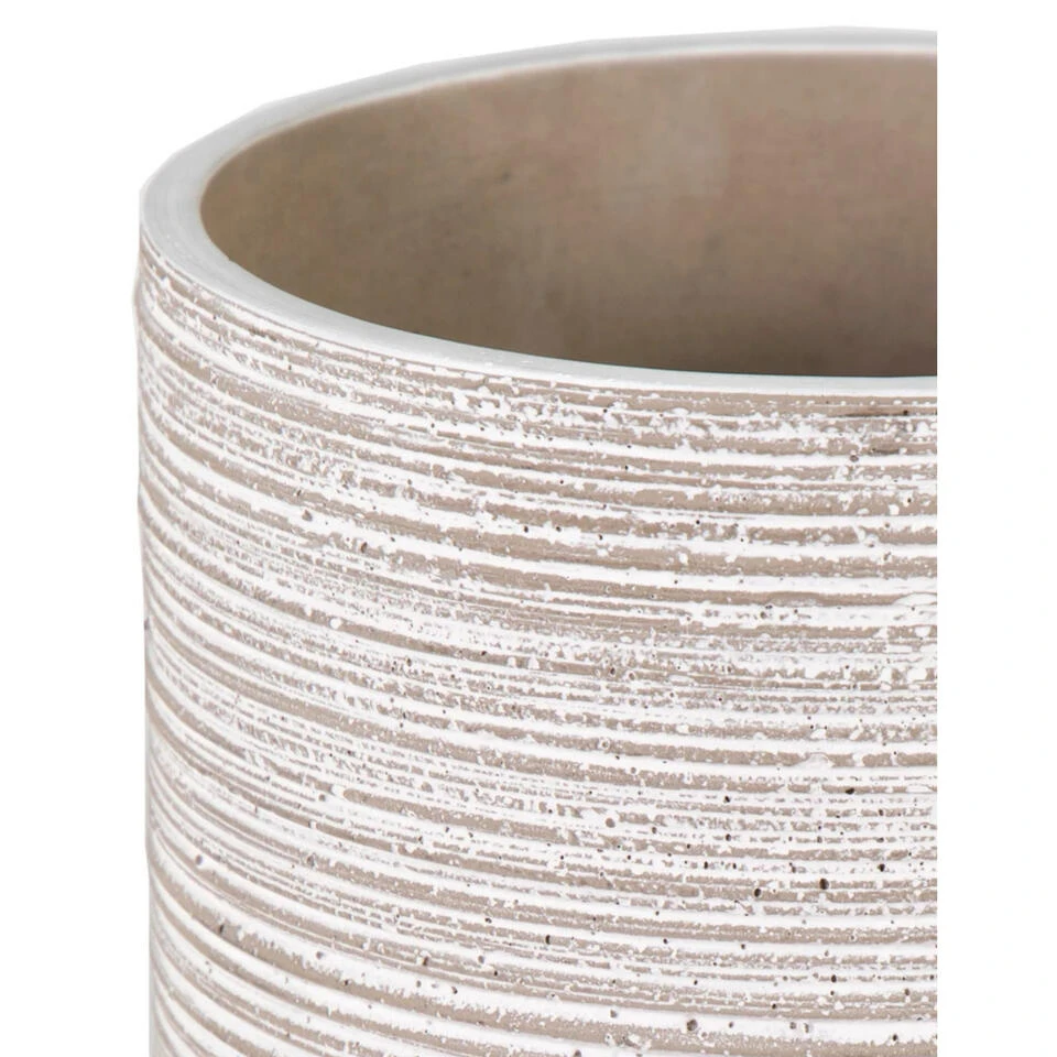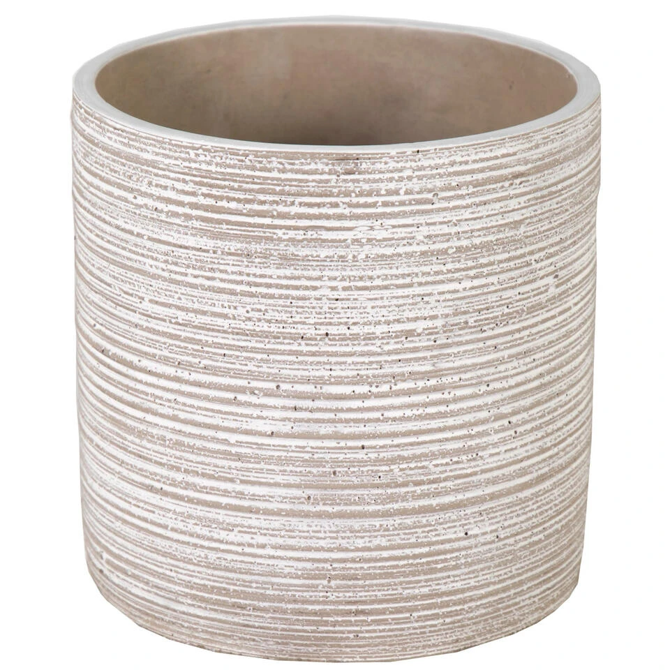 Plantenpot/bloempot gemaakt van keramiek in de kleur grijs/taupe met verwassen look en relief aan de buitenzijde. Afmetingen: Diameter 16 cm en Hoogte 16 cm. Vorm: cilinder. Deze prachtige bloempot uit de Ciao Cylinder serie voor binnen gebruik is een schitterende toevoeging aan uw interieur.