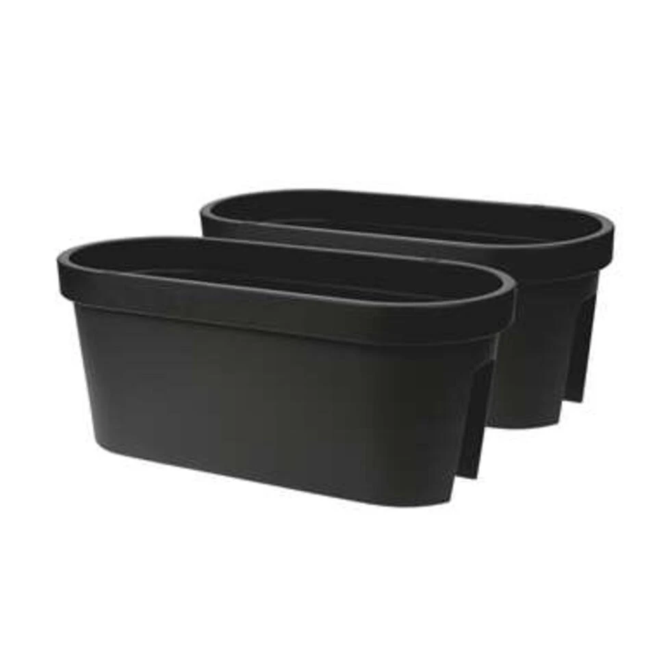 Balkon plantenbak/bloembak antraciet ovaal. Formaat: lengte ca 60 cm. Breedte ca 28 cm. Hoogte ca 25 cm. Materiaal: kunststof, kras en stootvast. Geschikt voor binnen en buiten gebruik.