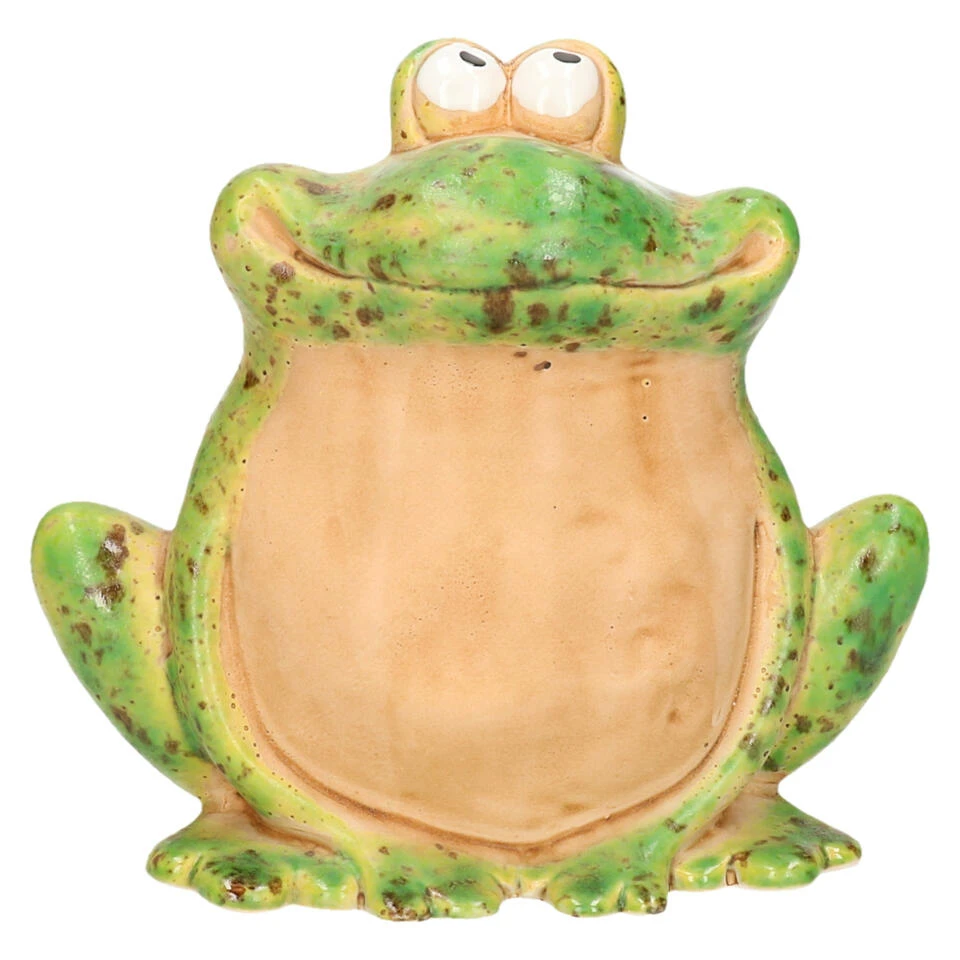 Tuinbeeld decoratie kikker zittend lachend met rechte bek en vrolijk humeur uitstralend gemaakt van kunststeen met afmetingen 17 x 16 x 12 cm. Kleur: diverse tinten groen en geel. De kikker in uw tuin of op balkon is altijd vrolijk. Breng sfeer in je tuin met beelden/beeldjes van dieren voor buiten. Vorstbestendig.