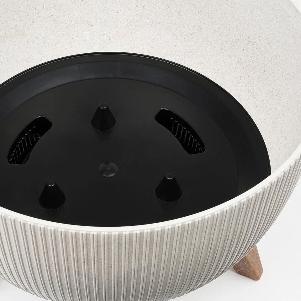 Geef jouw favoriete plant een prominente plek met deze Doppio schaal op poten van Mica Decorations. De off white pot bestaat voor 40% uit een mix van koffieschillen van restafval met gerecycled FSC®-gecertificeerd hout en voor 60% uit polypropyleen. De drie bruine pootjes zijn voor 40% gemaakt van gerecycled FSC®-gecertificeerd hout en 60% polypropyleen. De bloempot is daarnaast lichtgewicht, UV- en vorstbestendig. Door de uitneembare plug ontstaat er een drainagegat waardoor de pot een goede afwatering heeft. De pot is hierdoor geschikt voor zowel binnen als buiten. Erg mooi in combinatie met een kleurrijke plant. Deze off white bloempot op pootjes heeft een afmeting van H22 x Ø47 cm.