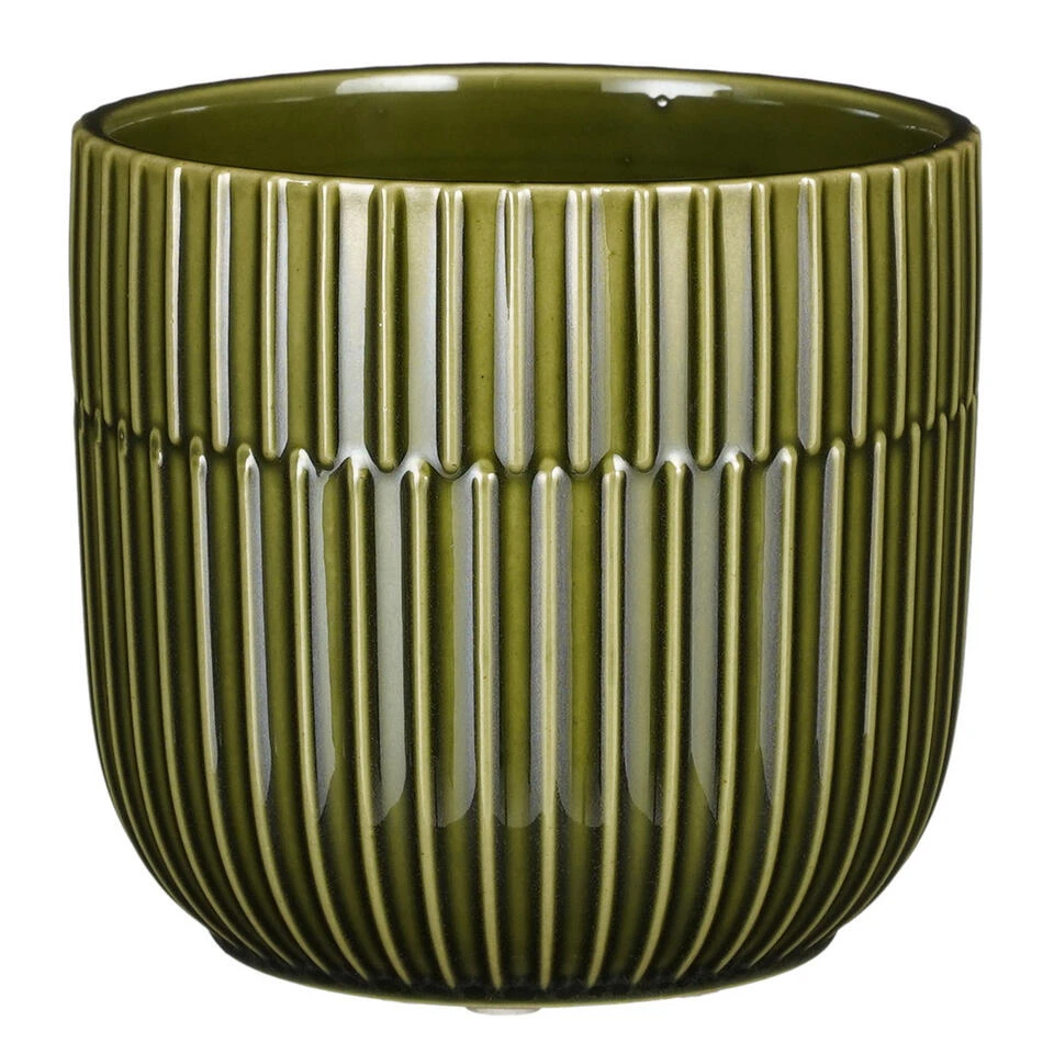 Plantenpot/bloempot van keramiek in de kleur glans donkergroen met een mooi verticale strepen patroon. Diameter 12.5 cm en hoogte 11 cm. Stijlvolle bloempotten voor binnen gebruik. Serie: Sara. De stijlvolle pot met het prachtige patroon aan de buitenzijde is met de hand gemaakt in Portugal. Derhalve is geen pot exact hetzelfde en hebben de bloempotten een echt karakter. Tip: zet een schotel onder de pot om eventueel lekken tegen te gaan. Potten van steen zijn niet 100% waterdicht.