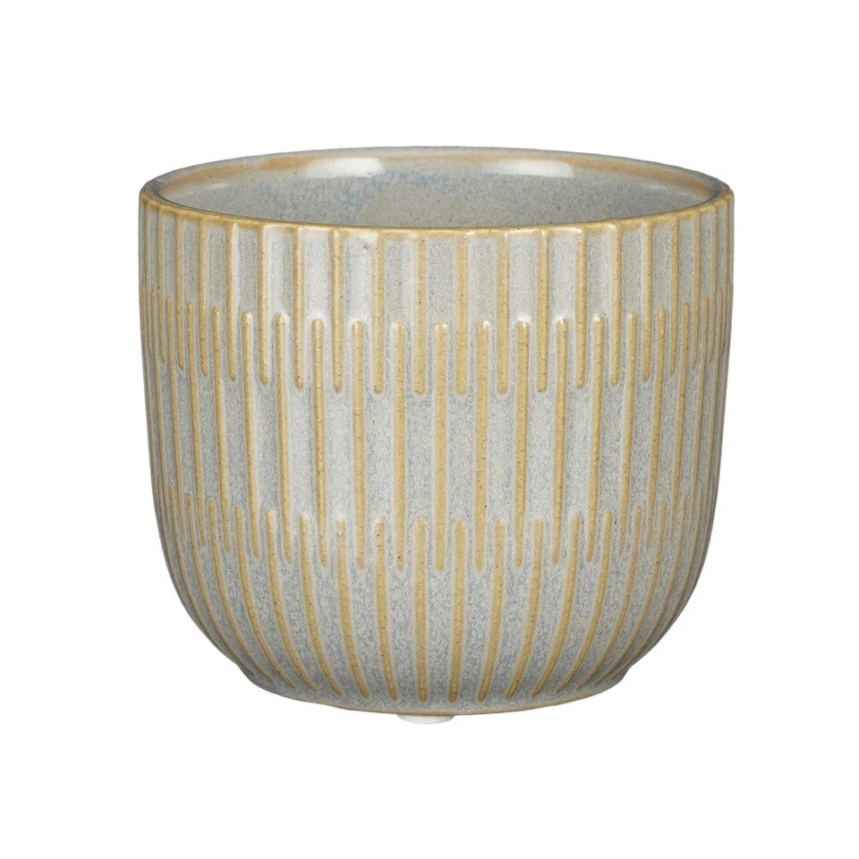 Plantenpot/bloempot van keramiek in de kleur lichtgrijs met een mooi verticale strepen patroon. Diameter 11 cm en hoogte 9 cm. Stijlvolle bloempotten voor binnen gebruik. Serie: Sara. De stijlvolle pot met het prachtige patroon aan de buitenzijde is met de hand gemaakt in Portugal. Derhalve is geen pot exact hetzelfde en hebben de bloempotten een echt karakter. Tip: zet een schotel onder de pot om eventueel lekken tegen te gaan. Potten van steen zijn niet 100% waterdicht.