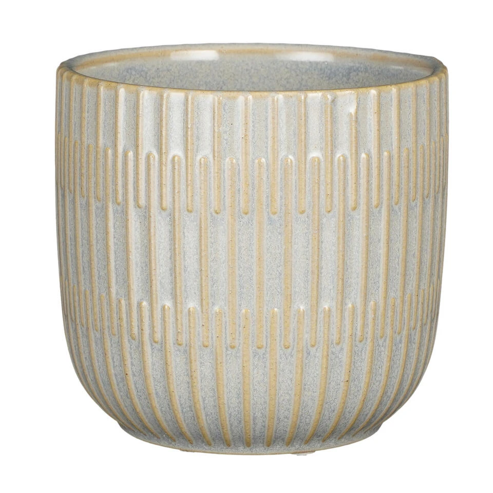 Plantenpot/bloempot van keramiek in de kleur lichtgrijs met een mooi verticale strepen patroon. Diameter 14 cm en hoogte 13 cm. Stijlvolle bloempotten voor binnen gebruik. Serie: Sara. De stijlvolle pot met het prachtige patroon aan de buitenzijde is met de hand gemaakt in Portugal. Derhalve is geen pot exact hetzelfde en hebben de bloempotten een echt karakter. Tip: zet een schotel onder de pot om eventueel lekken tegen te gaan. Potten van steen zijn niet 100% waterdicht.