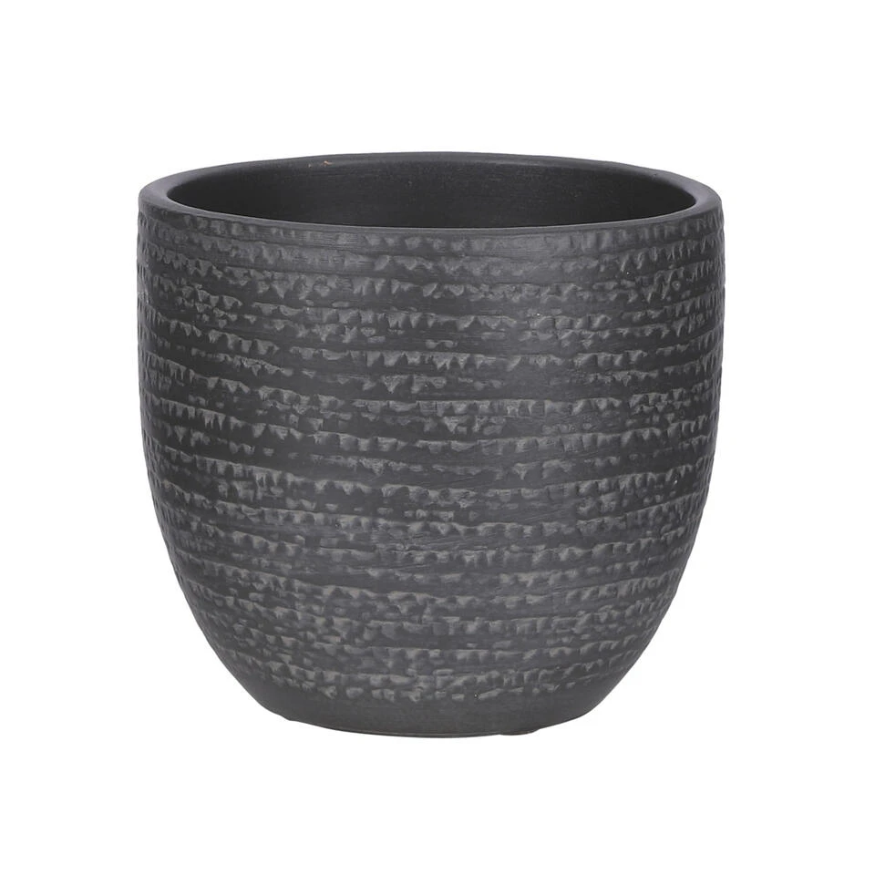 Plantenpot/bloempot van terracotta in de kleur zwart/grijs met een modern relief flakes patroon. Diameter 16 cm en hoogte 14 cm. Stijlvolle bloempotten voor binnen gebruik. Serie: Carrie. De zeer mooie potten met prachtige buitenzijde zijn met de hand gemaakt in Portugal. Derhalve is geen pot exact hetzelfde en hebben de bloempotten een echt karakter. Materiaal: Terracotta. Tip: zet een schotel onder de pot om eventueel lekken tegen te gaan. Potten van steen zijn niet 100% waterdicht.
