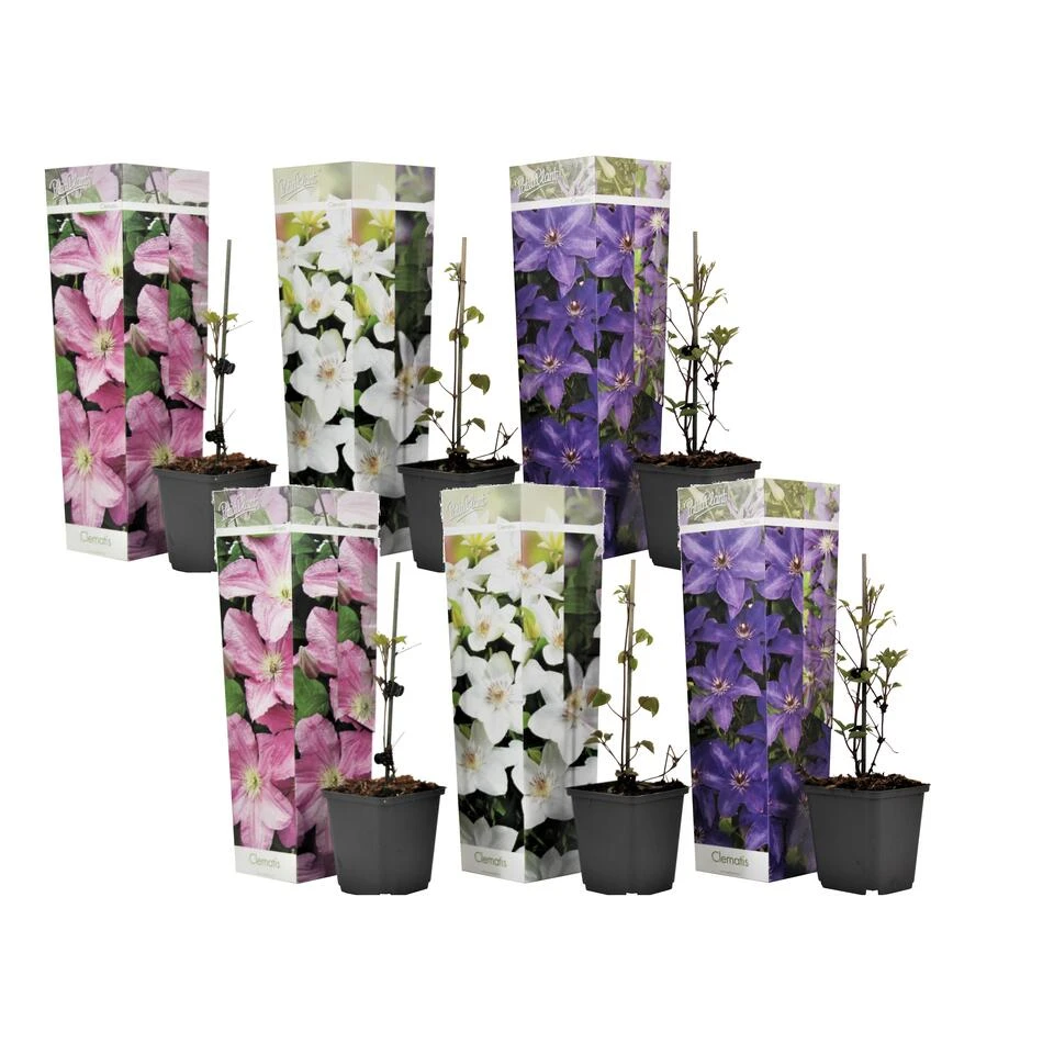 De Clematis, ofwel Bosrank, is al honderden jaren een van de populairste tuinplanten. Zelfs de oude Grieken en Romeinen waren naar verluid al fan. Doordat de Clematis al sinds de oudheid populair is, zijn er inmiddels vele kruisingen te verkrijgen. De Clematis wordt ook wel de koningin van de klimplanten genoemd. Ze is namelijk makkelijk te verzorgen, heeft een lange bloeiperiode en bestaan in alle soorten, kleuren en maten. In deze mix zitten 3 heel verschillende Clematis klimplanten, namelijk de volgende soorten: