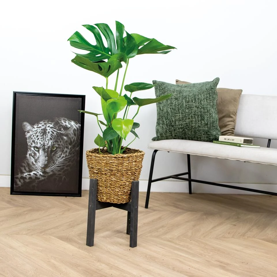 Een regelrechte tropische topper: de Monstera Deliciosa Incl. zeegras Mand Coco. Met zijn grote, groene bladeren heeft deze gatenplant ook nog eens luchtzuiverende eigenschappen. Op deze manier produceert hij extra zuurstof en filtert hij schadelijke stoffen uit de lucht. Zijn grote bladeren bevatten gaten en worden met de jaren alsmaar groter wat hem erg bijzonder maakt. Een kamerplant die niet alleen zorgt voor een beter binnenklimaat, maar die ook nog eens de show steelt!