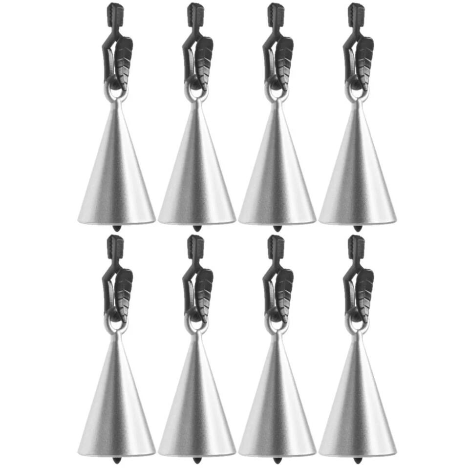 Set van 4x zilverkleurige tafelkleed/tafelzeil gewichtjes hangers in de vorm van kegels. Deze hangers kunnen aan een tafelkleed/tafelzeil gehangen worden zodat deze niet weg kan waaien.
