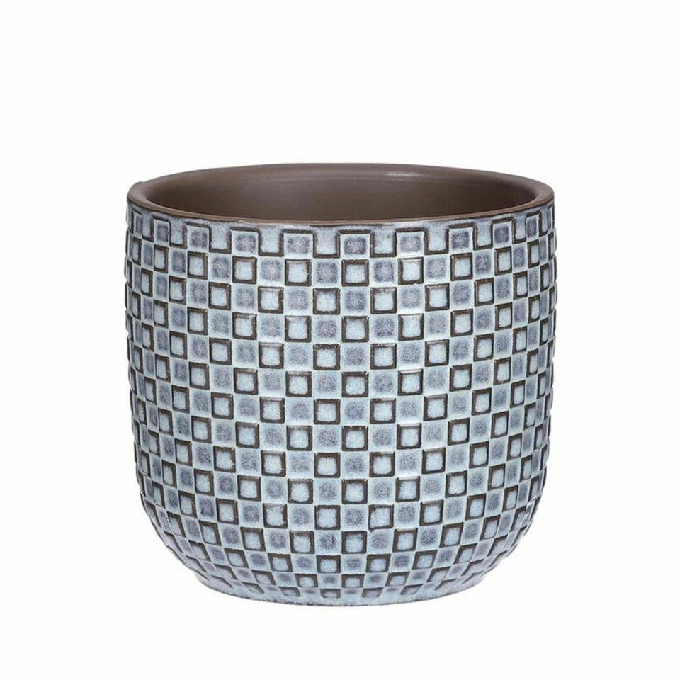 Plantenpot/bloempot van keramiek in de kleur blauw met een mooi patroon. Diameter 12 cm en hoogte 11 cm. Stijlvolle bloempotten voor binnen gebruik met een glanzende finish. Serie: Daan. Het vierkantjes patroon aan de buitenzijde van de pot geeft het geheel een modieus fraai stijlvol uiterlijk. Handgemaakt keramiek.