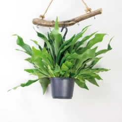 Donβt leave me hanging, want deze unieke Platycerium Bifurcatum kan je ook fantastisch stijlen in een pot. Deze Herftshoornvaren heeft zijn naam te danken aan zijn zilvergroene geweivormige bladeren. Niet alleen hebben de bladeren aan deze varen een unieke look en feel, ook hebben deze een voedingsfunctie. Zo kleuren de middelste bladeren van de varen bruin β verwijder dit blad niet. Deze zorgen namelijk voor extra steun en wanneer zij eraf vallen geven zij weer extra voeding aan de plant. Dit maakt de plant niet alleen uniek om naar te kijken, maar ook nog eens bijzonder efficiΓ«nt.