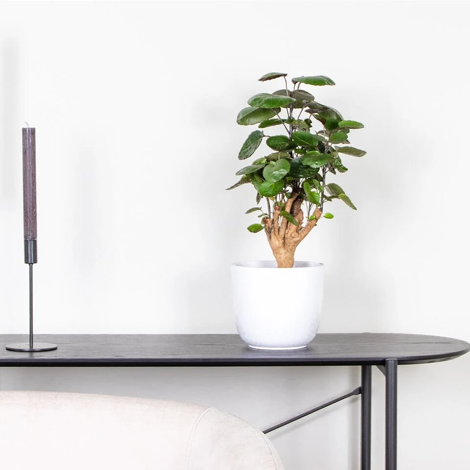 Hier zie je de Polyscias scutellaria βFabianβ. Een klein boompje voor bij jou in huis! Oorspronkelijk groeit de Polyscias op eilanden in de Pacifische oceaan. In het wild worden deze bomen zoβn 2 – 6 meter hoog en zorgen ze met hun grote bladeren voor veel schaduw. Polyscias betekent dan ook βveel schaduwβ in het Grieks. βFabianβ heeft echter een handiger formaat, zodat je binnenshuis ook van deze prachtboom kunt genieten. Deze compacte kamerplant heeft een dikke houten stam. Dit kleine, vertakkende boompje krijgt bladeren over de volledige lengte van zijn takken. Dit zorgt voor een fijne mix aan natuurlijke kleuren.