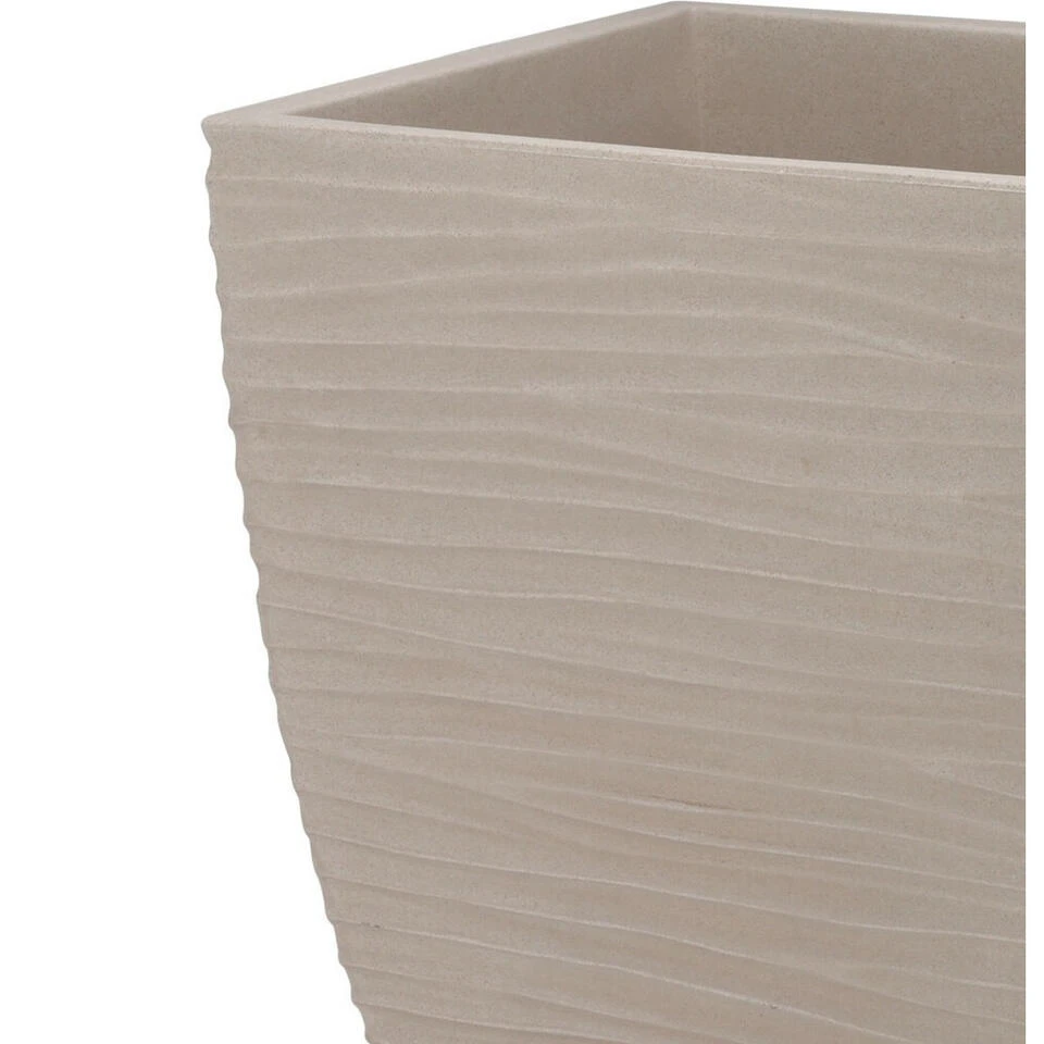 Plantenpot/bloempot Dunes gemaakt van stevig kunststof(Polyethyleen) in de kleur zand/beige met golvende ribbel strepen aan de buitenzijde. Deze mooie bloempot uit de Dunes serie is een schitterende toevoeging aan uw tuin/terras. De pot is dubbelwandig. Voor buiten gebruik. Afmetingen: D40 x H60 cm.