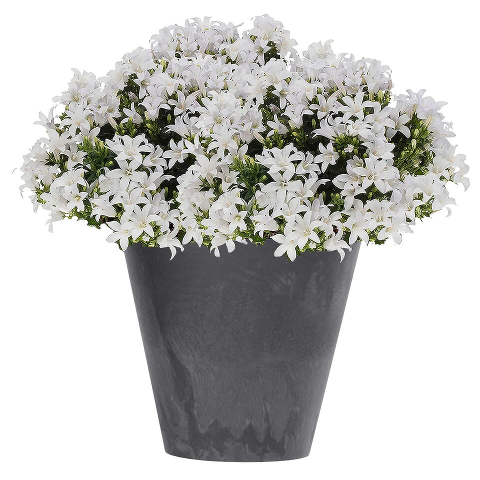 Kunststof bloempotten/plantenpotten betonlook 30 cm antraciet grijs. Formaat: diameter bovenkant: ca 30 cm. Hoogte: ca. 28 cm. Inhoud: ongeveer 12 liter. Materiaal: kunststof. De bloempotten hebben een gat in de bodem waardoor het overtollige water wegloopt. De potten zijn geschikt voor binnen en buiten gebruik.