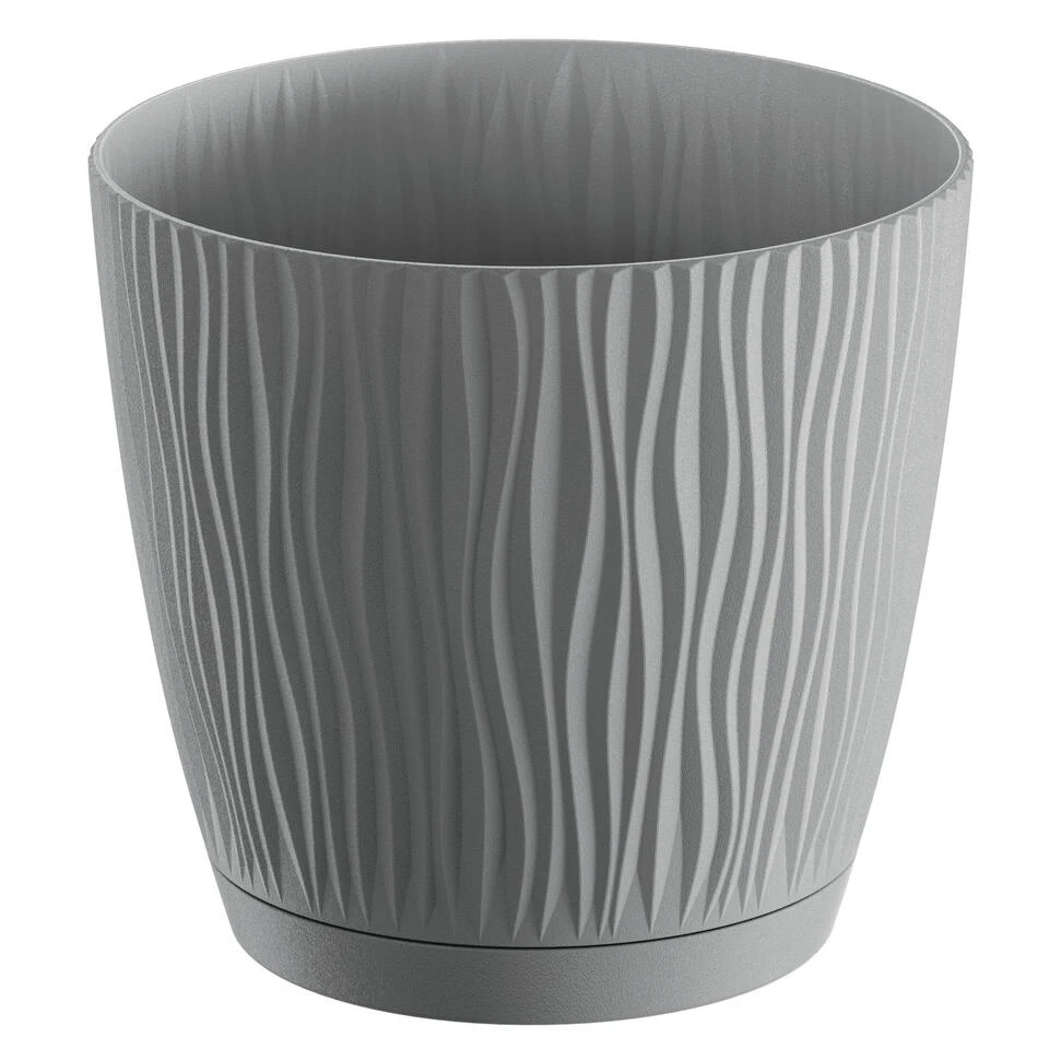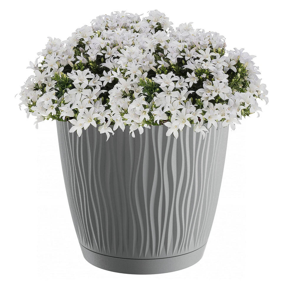 Stijlvolle kunststof plantenpot/bloempot dia 24 cm/hoogte 22.5 cm Waves steengrijs. Geschikt voor buiten en binnen. Vorstbestendig ja. Mooie plantenpotten voor in de tuin, balkon, kantoor of in de woonkamer.