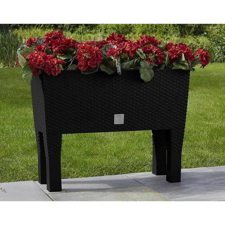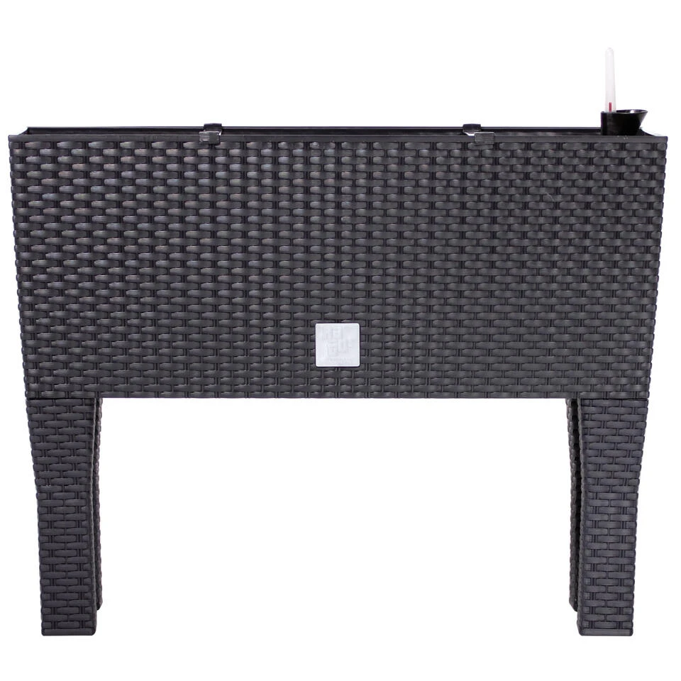 Bloembak/plantenbak op poten met ingebouwd irrigatie systeem inclusief waterniveau meter. Serie: Rato. Formaat: lengte: ca 80 cm. Breedte: ca 33 cm. Hoogte: ca 62 cm. Inhoud: 72 liter. Materiaal: kras en stootvast kunststof. De aarde in de plantenbak wordt door een drainageplaat gescheiden van een waterreservoir. De hoeveelheid water kan worden afgelezen aan de stand van de rode vlotter. Het waterreservoir is gemakkelijk bij te vullen via een buis aan de bovenkant van de bak. Geschikt voor binnen en buiten gebruik.