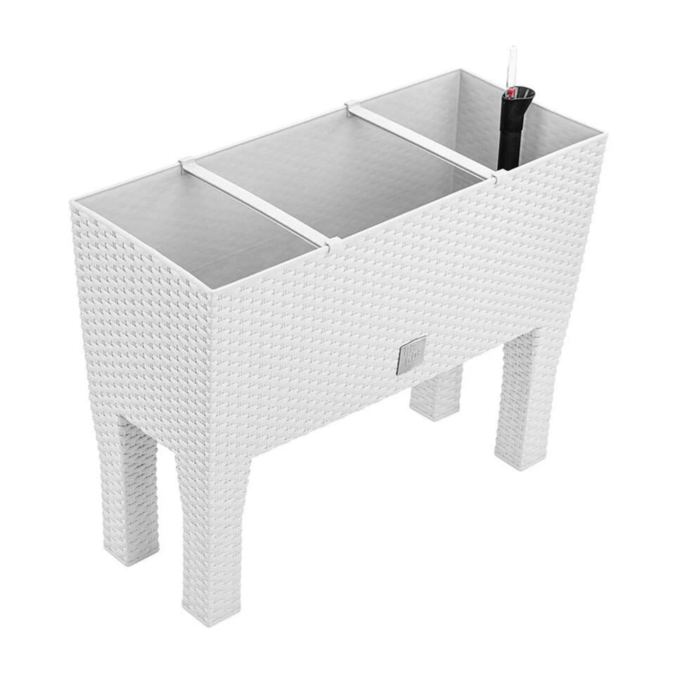 Bloembak/plantenbak op poten met ingebouwd irrigatie systeem inclusief waterniveau meter. Serie: Rato. Formaat: lengte: ca 80 cm. Breedte: ca 33 cm. Hoogte: ca 62 cm. Inhoud: 72 liter. Materiaal: kras en stootvast kunststof. De aarde in de plantenbak wordt door een drainageplaat gescheiden van een waterreservoir. De hoeveelheid water kan worden afgelezen aan de stand van de rode vlotter. Het waterreservoir is gemakkelijk bij te vullen via een buis aan de bovenkant van de bak. Geschikt voor binnen en buiten gebruik.