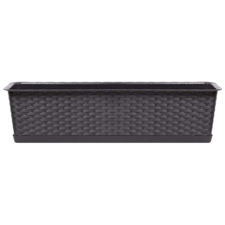 Kunststof Ratolla rotan plantenbak/bloembak/balkonbak set donkerbruin 8 liter met bijpassende opvangschotel/opvangbak. Kras en stootvaste bloembak/plantenbak met rotan vlechtwerk uitstraling. Zonder afwateringsgaten, deze kunt u naar wens zelf maken. De bloembakken/plantenbakken zijn geschikt voor binnen en buiten gebruik. Serie: ratolla case. Formaat: lengte ca 50 cm. Breedte: ca 17,3 cm. Hoogte: ca 14,5 cm. Inhoud: 8 liter.