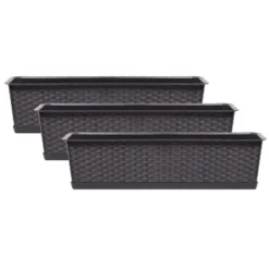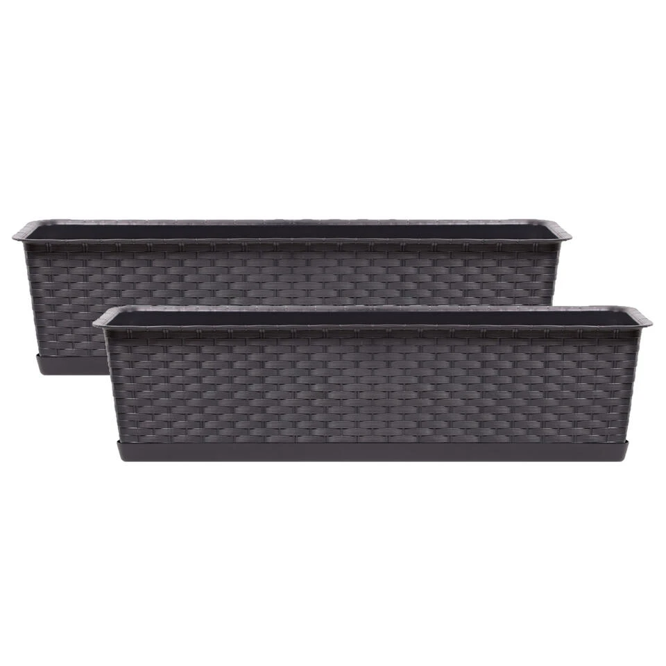 Kunststof Ratolla rotan plantenbak/bloembak/balkonbak set donkerbruin 10 liter met bijpassende opvangschotel/opvangbak. Kras en stootvaste bloembak/plantenbak met rotan vlechtwerk uitstraling. Zonder afwateringsgaten, deze kunt u naar wens zelf maken. De bloembakken/plantenbakken zijn geschikt voor binnen en buiten gebruik. Serie: ratolla case. Formaat: lengte ca 60 cm. Breedte: ca 17,3 cm. Hoogte: ca 14,5 cm. Inhoud: 10 liter.