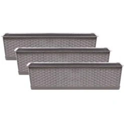 Kunststof Ratolla rotan plantenbak/bloembak/balkonbak set taupe 10 liter. Kras en stootvaste bloembak/plantenbak met rotan vlechtwerk uitstraling. Zonder afwateringsgaten, deze kunt u naar wens zelf maken. De bloembakken/plantenbakken zijn geschikt voor binnen en buiten gebruik. Serie: ratolla case. Formaat: lengte ca 60 cm. Breedte: ca 17,3 cm. Hoogte: ca 14,5 cm. Inhoud: 10 liter.