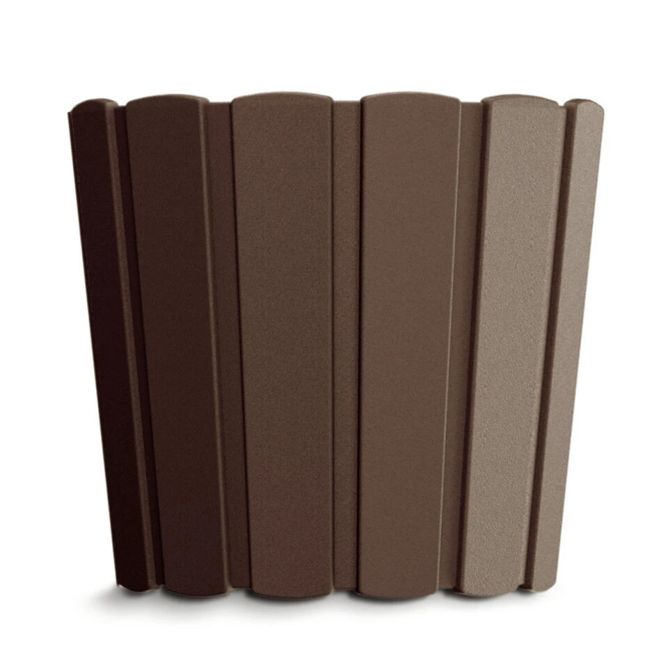 Wood-look/plankjes stijl plantenpot/bloempot van kunststof met diameter 24 cm en hoogte 22 cm in het houtbruin. Geschikt voor buiten en binnen. Vorstbestendig ja. Coole plantenpotten voor in de tuin, serre, balkon of binnen.