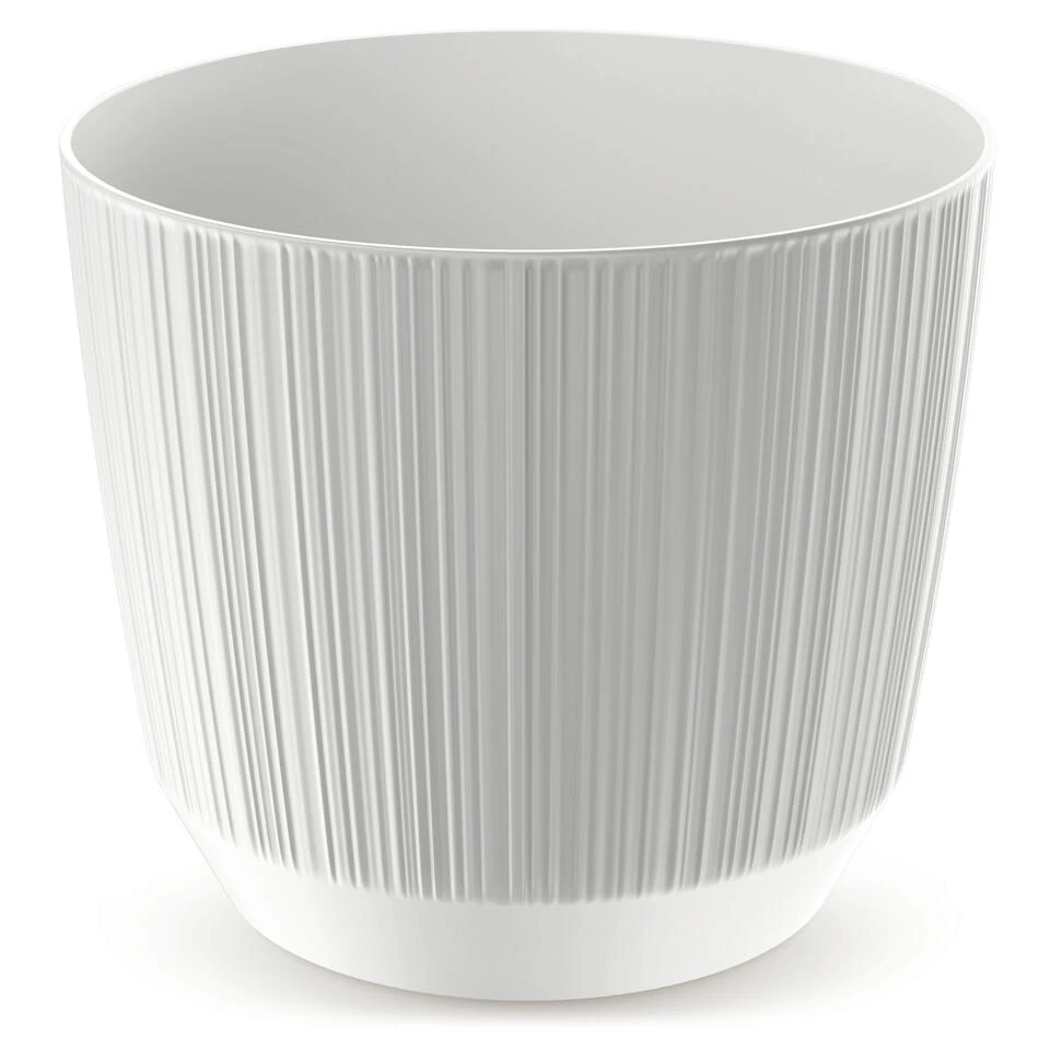 Moderne carf-stripe plantenpot/bloempot van kunststof met diameter 19.5 cm en hoogte 17 cm in het parel wit. Geschikt voor buiten en binnen. Vorstbestendig ja. Basic plantenpotten voor in de tuin, balkon of binnen.