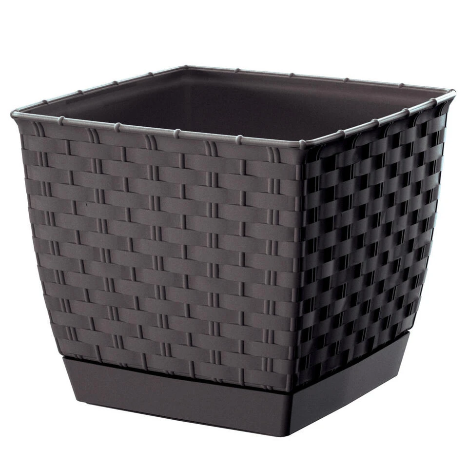 Plantenpot/bloempot rotan kunststof 19 x 19 cm en hoogte 16 cm donkerbruin. Geschikt voor buiten en binnen. Mooie stijlvolle gevlochten kunststof uitstraling. Vorstbestendig ja. Basic vierkante plantenpotten voor in de tuin, balkon of binnen met water opvangbak.