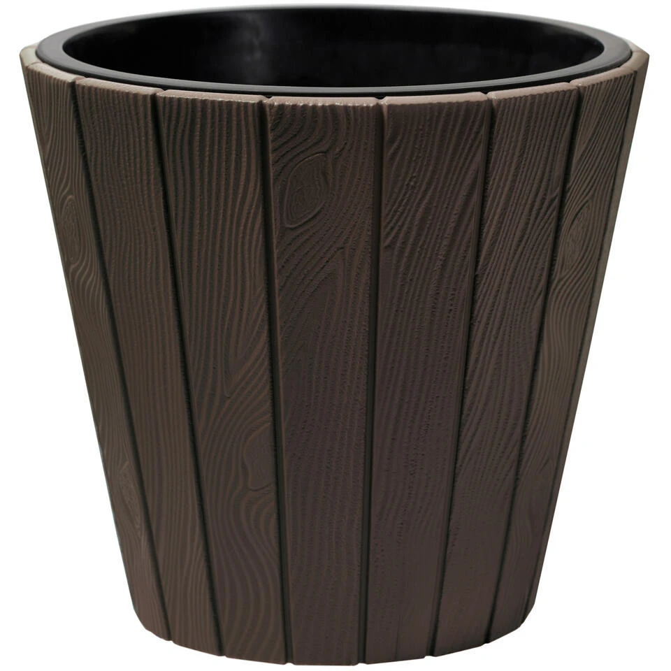 Plantenpot/bloempot uit de Wood Style collectie is gemaakt van PP kunststof in de kleur donkerbruin met een houten planken patroon aan de buitenzijde. Deze prachtige ronde bloempot is echt een schitterende toevoeging aan uw tuin/terras/huis. De bloempot is voor buiten en binnen gebruik geschikt en heeft een losse binnenpot met hendels. De kunststof constructie van de plantenpot maakt dat de pot licht van gewicht is, waardoor hij makkelijk is te verplaatsten. Formaat: Diameter 35 cm x Hoogte 32 cm. UV en vorst bestendig.