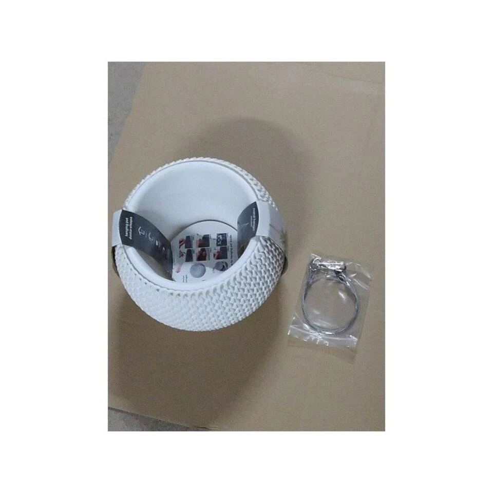 Witte kunststof hangende Splofy bloempotten/plantenpotten 24 cm inclusief metalen haak. Kras en stootvaste ophang bloempotten/plantenbakken met de uitstraling van zachte, grof gebreide wol. De hangende bloempotten/plantenpotten zijn uitgerust met een binnenbak en een metalen haak. De ophangpotten zijn geschikt voor binnen en buiten gebruik. Serie: Splofy round ws. Formaat: diameter: ca 23,9 cm. Hoogte: ca 16,1 cm. Inhoud: 2,3 liter. Materiaal: kunststof. Tuin/huisdecoratie hang bloempot/plantenbak.