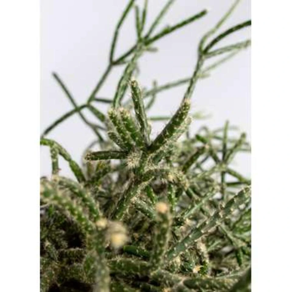 De Rhipsalis pilocarpa heeft dunne koraalachtige stengels met lichtgekleurde donshaartjes die de plant een zilverkleurig effect geven. Een rhipsalis is een makkelijke kamerplant die je gerust een keertje mag vergeten water te geven. Het is een succulent van de cactusfamilie die vaak als hangplant voorkomt. De stengels van deze plant hebben een unieke vorm die doet denken aan koraal. In Nederland noemen we deze kamerplant daarom ook wel koraalcactus. Oorspronkelijk komt deze plant voor in Afrika, Zuid- en Midden-Amerika en enkele eilanden in de Indische Oceaan. In tegenstelling tot andere leden uit de Cactaceae familie, komt deze cactus dus uit de tropen. Hij heeft dan ook andere verzorgingsbehoeften in vergelijking tot de meeste cactussen.
