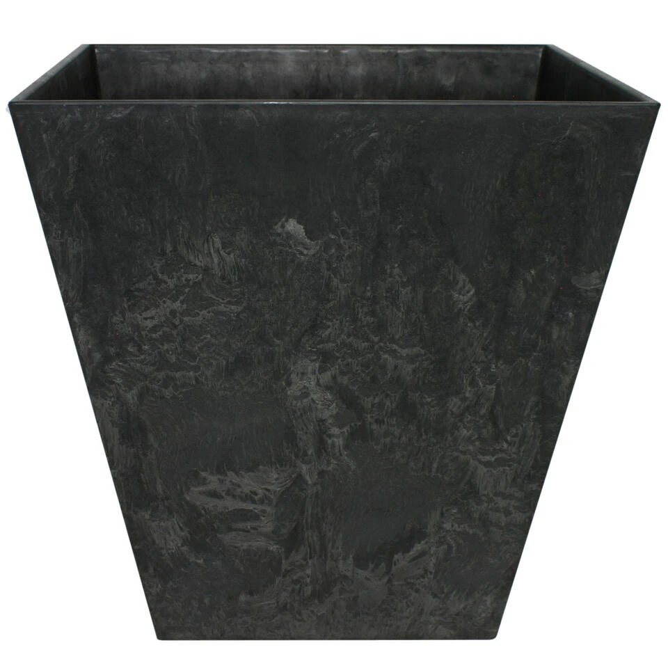 Bloempot/plantenpot vierkant van gerecycled kunststof en steenpoeder in de kleur zwart/betonlook met diameter 35 cm en hoogte 35 cm. Artstone Ella serie potten voor buitenplanten, binnenplanten of kunstplanten. Een unieke duurzame mix van materialen dat nu geen afval is, maar een prachtige duurzame bloempot, 100% recyclebaar. Deze serie potten hebben een eigen drainagesysteem onderin de pot met water plug zodat ze geschikt zijn voor binnen en buiten.