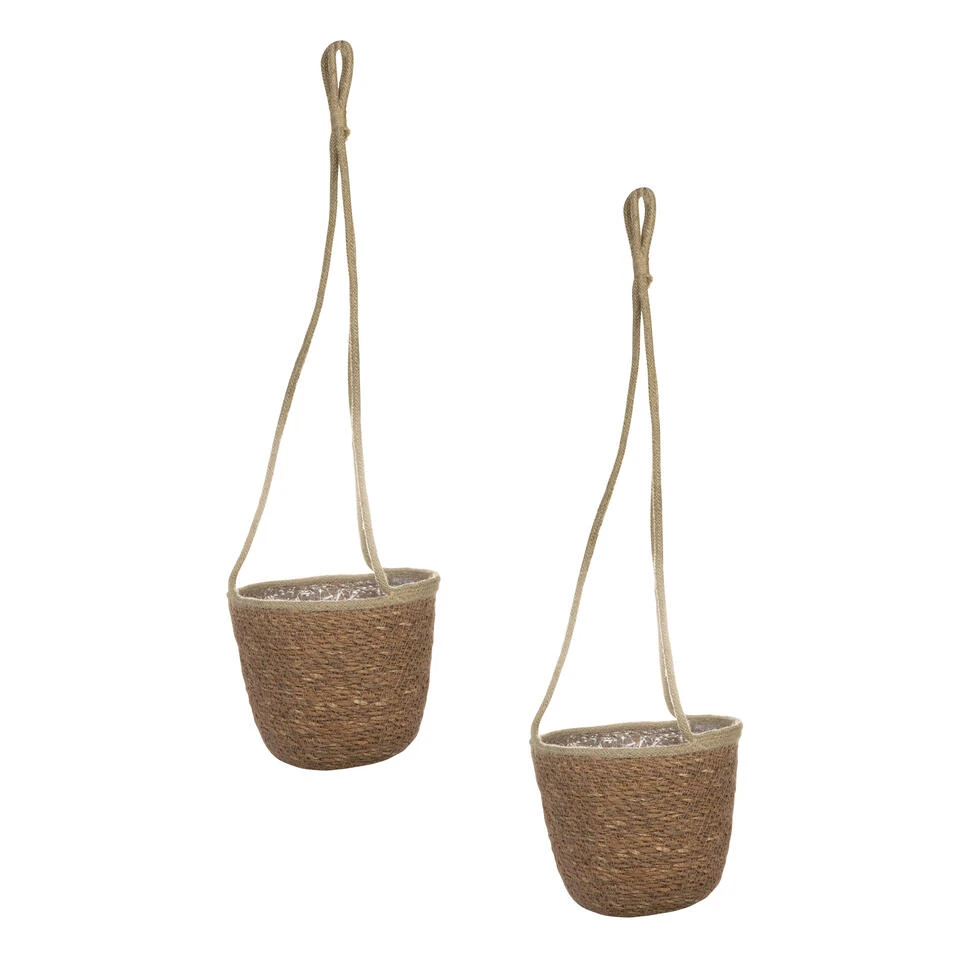 Hangende plantenpot/bloempot/mand van jute/zeegras met een diameter van 19 cm en een hoogte van 17 cm in de kleur camel bruin. Uit de hand geweven Naturals collectie voor binnenshuis gebruik. De pot mand heeft een binnenkant van plastic. Voor kamerplanten en bloemen of kunstplanten.